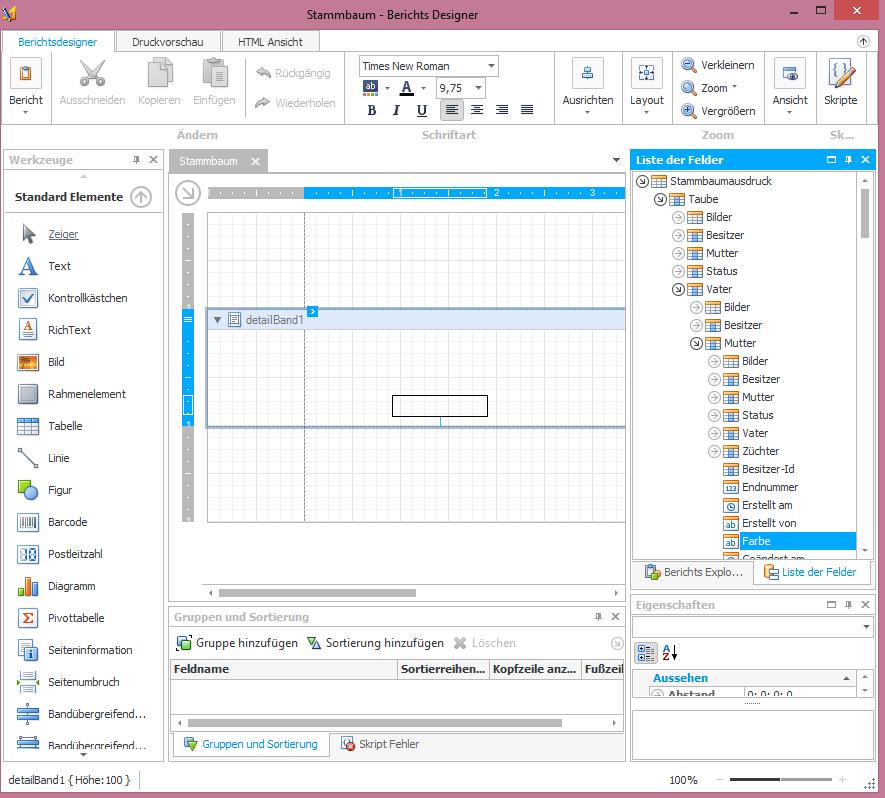- Symbole rechts oben: Datenfelder, die mit gedrückter Maustaste auf den Inhalt ziehen, damit diese angezeigt werden. Hier ist es möglich beliebig viele Generationen für die Anzeige auszuwählen (z.B. Taube -> Vater -> Vater -> Mutter ->Ringnummer für die Ringnummer der Ur-Großmutter einer Taube)