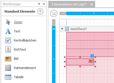 - Symbole links: Objekte (z.B. Text / Bild / Linie / Tabelle) die im Ausdruck verwendet werden können