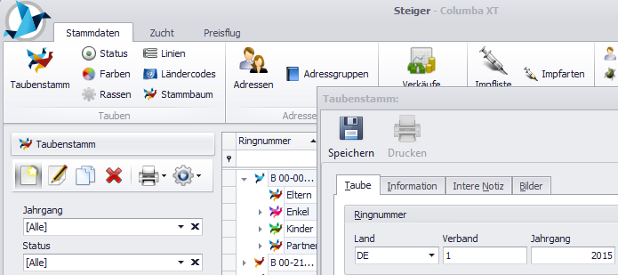 - Taubenstamm: Mehrfachauswahl und direkter Stammbaumdruck über Kontextmenü