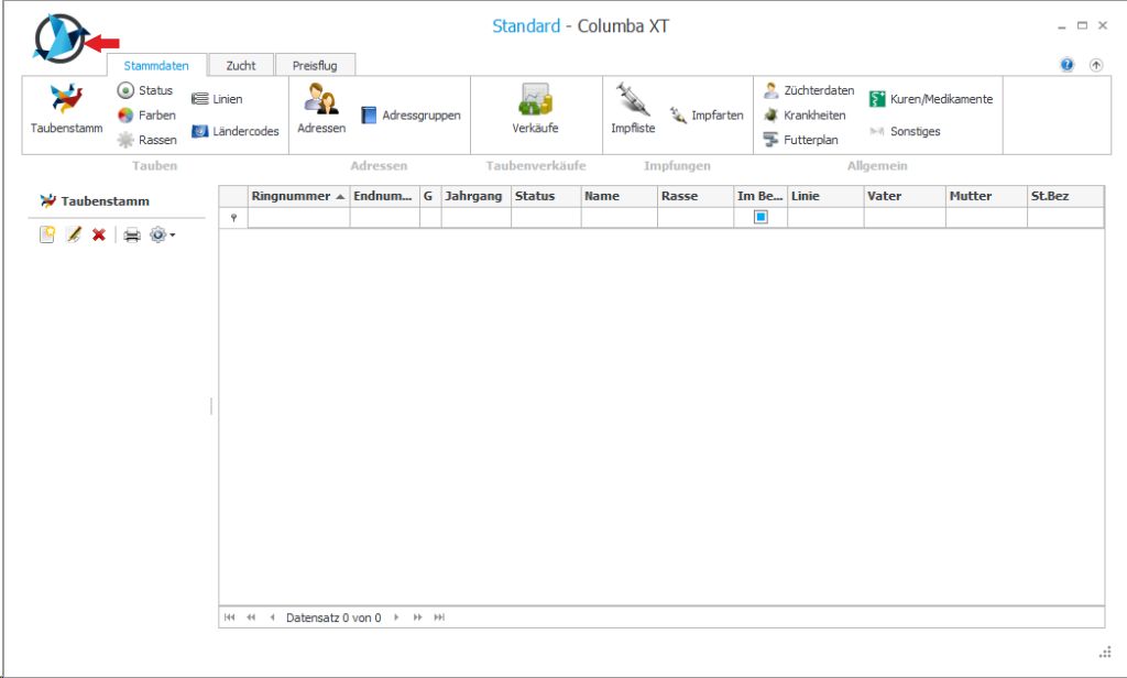 Klicken Sie dazu zunächst auf das Symbol mit der blauen Taube, oben links im Hauptprogrammfenster. Danach öffnet sich das Programmmenü wie auf dem nächsten Bild zu sehen.