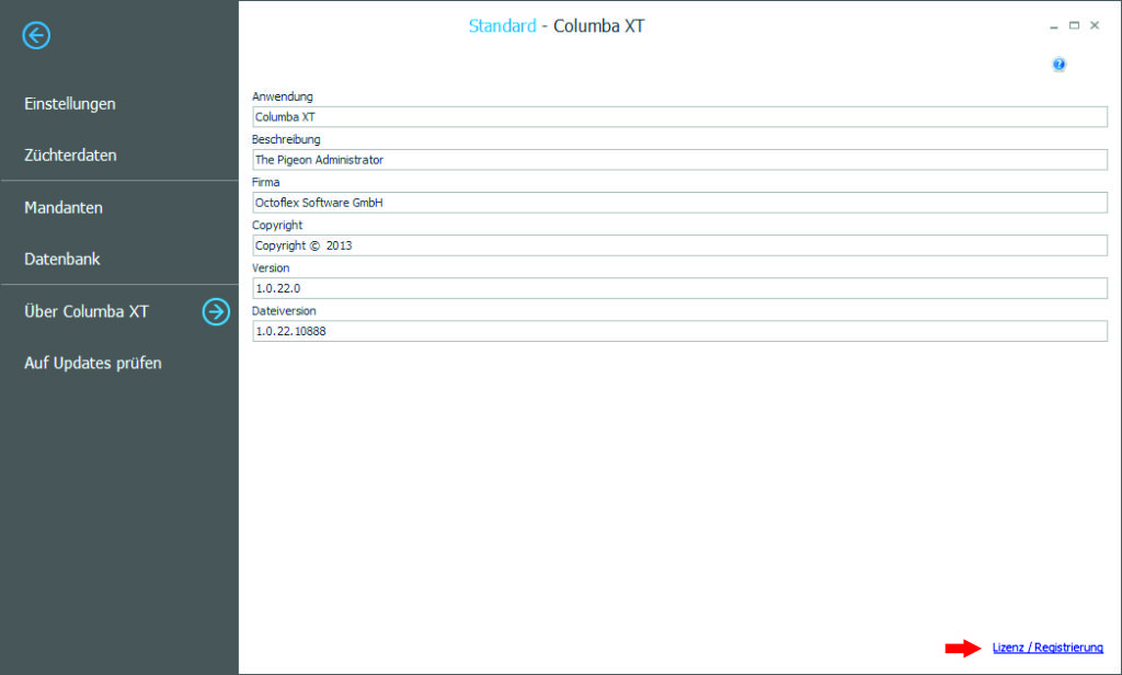 In diesem Fenster sehen Sie oben die Versions- und Programminformationen. Unten rechts in diesem Fenster klicken Sie bitte auf den Link "Lizenz / Registrierung".