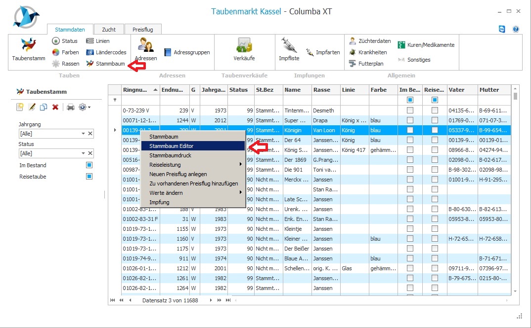 Den Stammbaumeditor können Sie über die Schaltfläche 'Stammbaum' in der Menüleiste, oder über einen Rechtsklick auf eine Taube im Taubenstamm und den Menüpunkt 'Stambaum Editor' aufrufen.