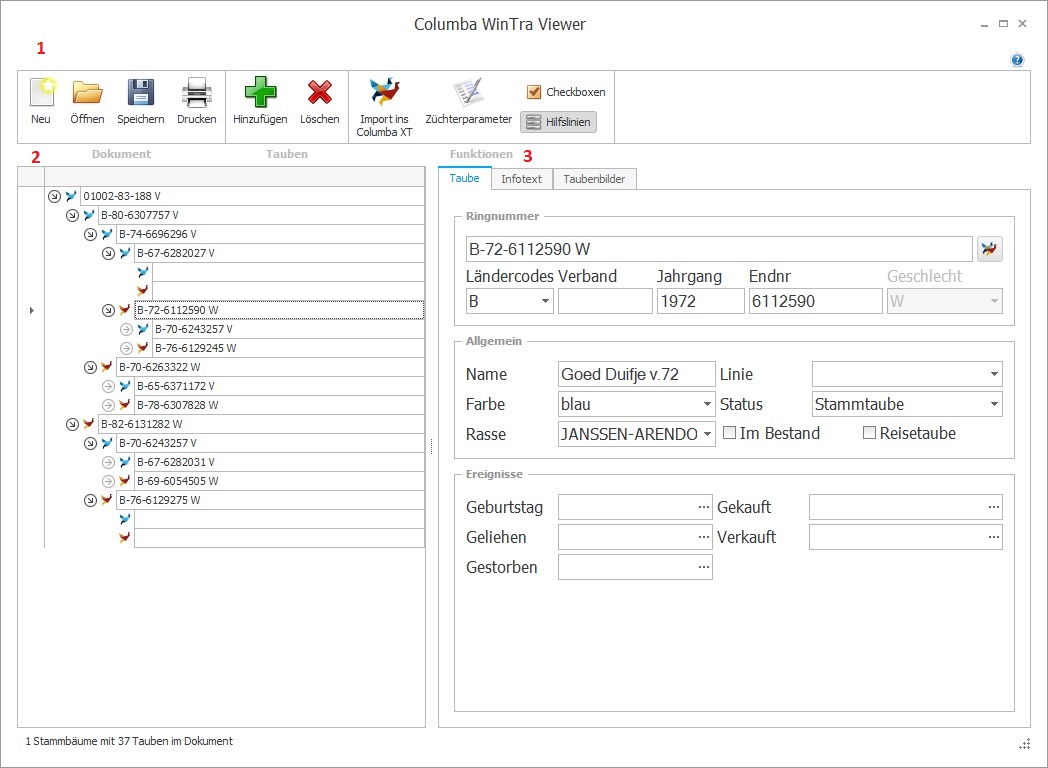 Mit dem Editor lassen sich komfortabel Stammbäume bearbeiten, neue Tauben und Stammbäume anlegen, sowie erstellte Stammbäume an andere Nutzer des Columba XT oder des Columba Viewers verschicken.