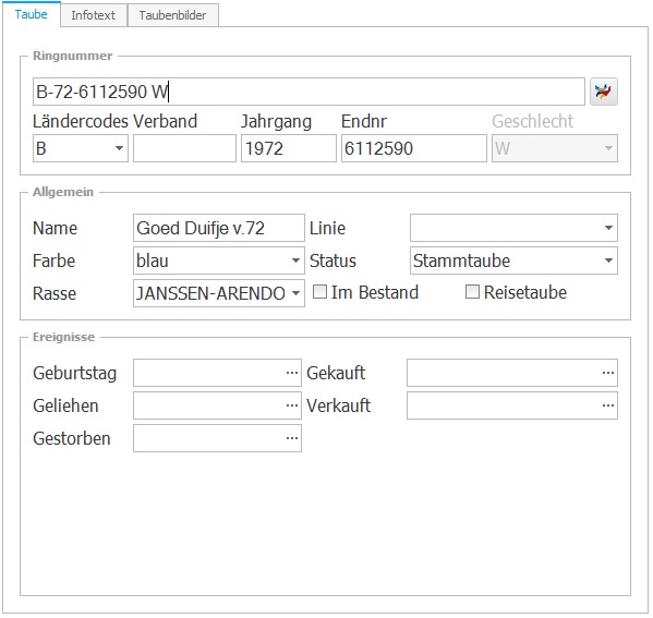 Neben den Grunddaten auf der ersten Seite, können Sie auch den Infotext bearbeiten und der Taube Bilder zuweisen, indem Sie oben auf den entsprechenden Reiter 'Infotext' oder 'Taubenbilder' klicken.
